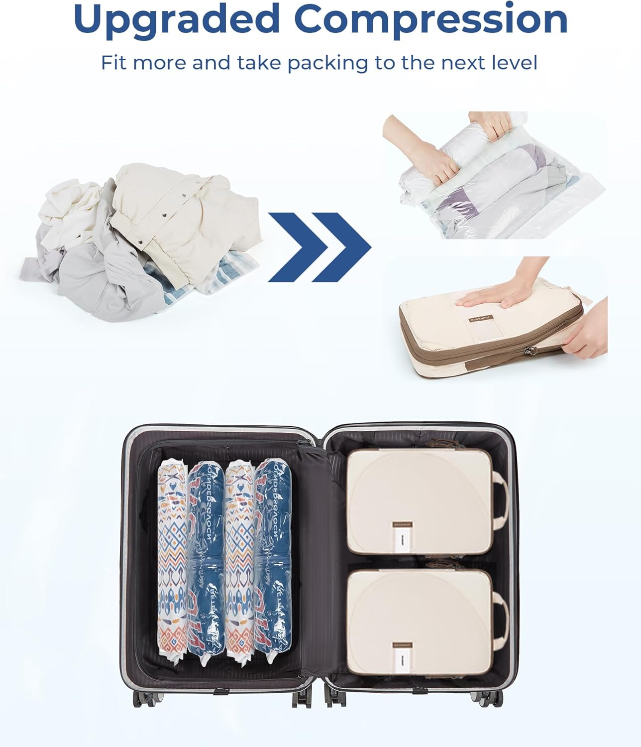 But wait, there’s more! This set also includes 4 vacuum storage bags, perfect for compressing bulky items like jackets, sweaters, and blankets. Simply pack your items in the bag, seal it shut, and use a vacuum cleaner to remove excess air – saving you valuable space in your luggage.